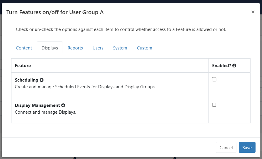 As for assigning displays, it’s not necessary to explicitly assign a display to a user group.
