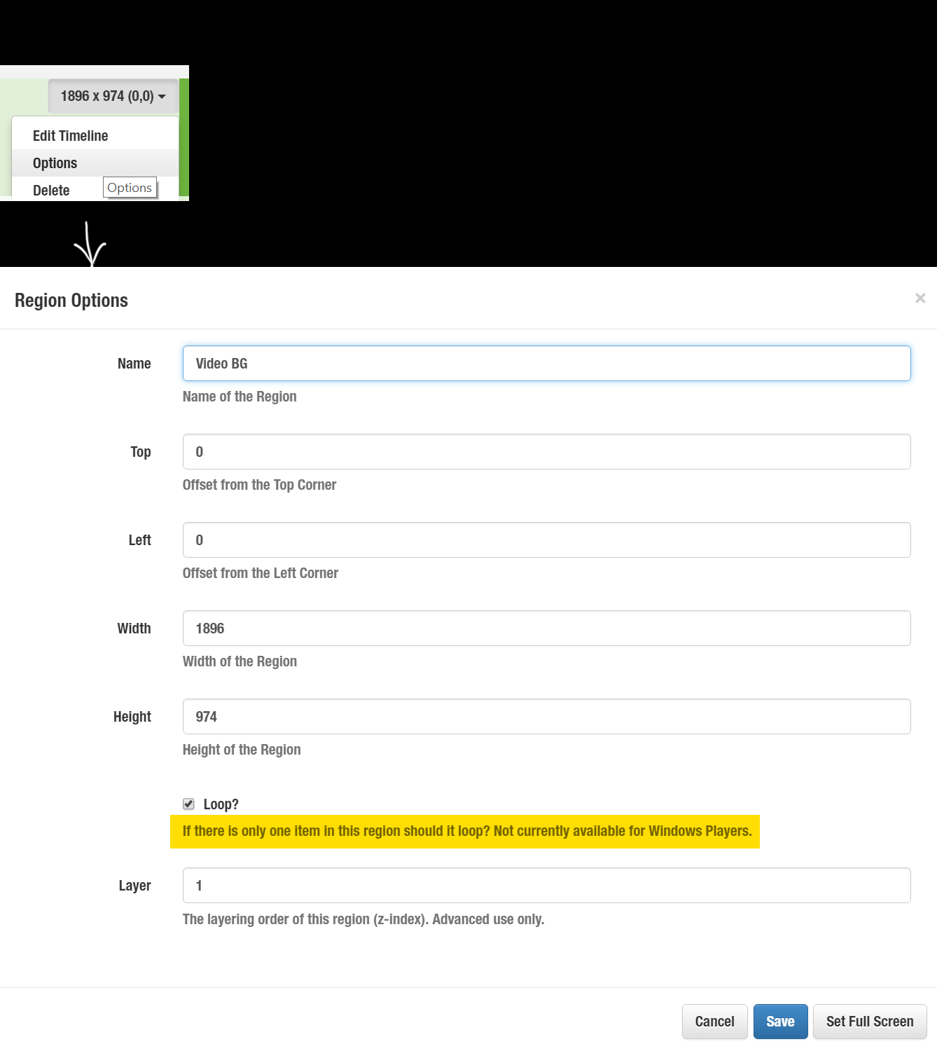 On the looping thing, I clicked “preview” and it only played a layout once. Maybe that’s just with the preview and not on actual installation. I just assumed that was the case when I saw this notice when editing the timeline object (click here to view example).