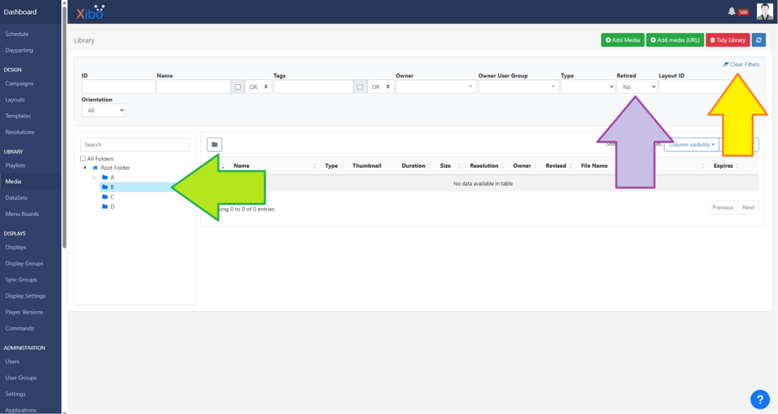 Can you go to the Media page in your CMS and select that folder in the tree on the left of the page, so I can see that nothing is being shown there? For example, you can see in my screenshot I have selected the B folder (green arrow):