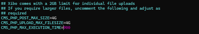 Xibo comes with a 2GB limit for individual file uploads
