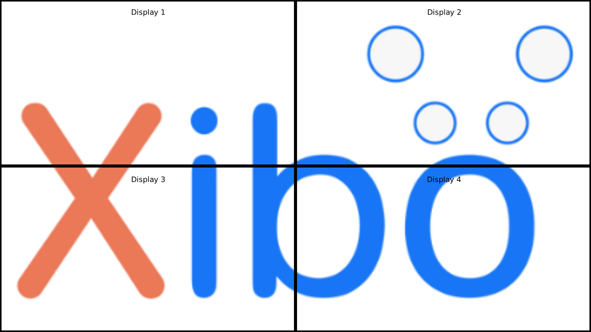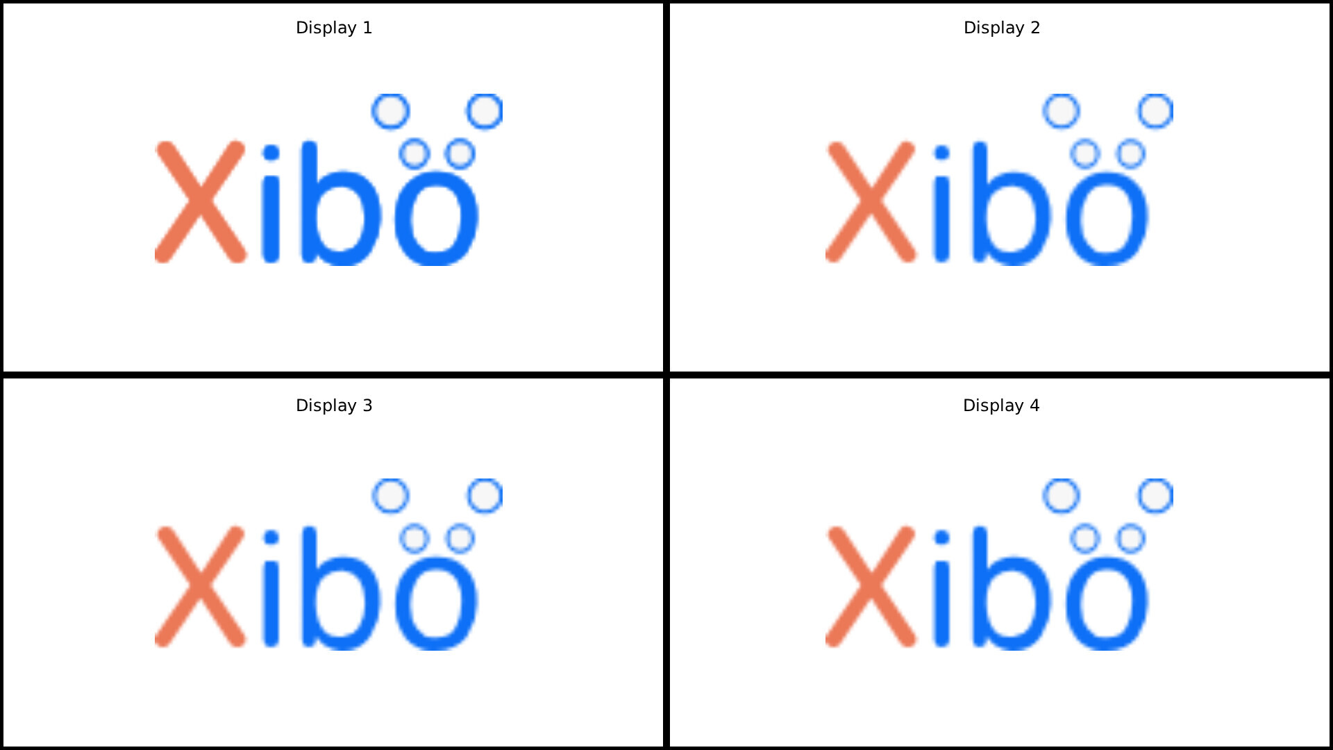 If the Xibo logo example at the top of the post were a video 3840x2160 pixels in size, and the 4 displays were all 1080p, the following commands would split the video into 4 1080p videos with the following file names:
