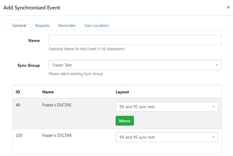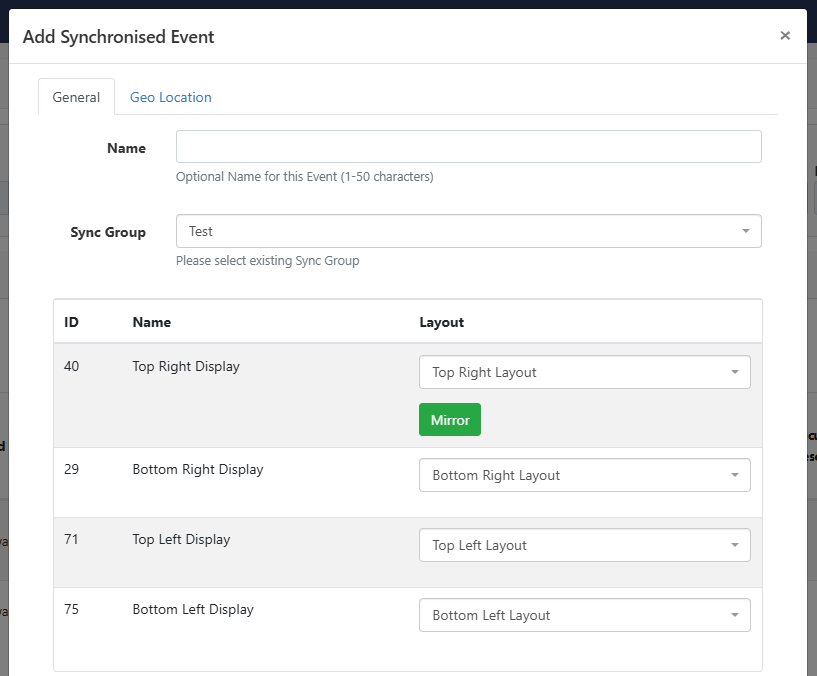 Select the âSync Groupâ that you wish to show the event on, then select the Layout in the drop-down box that appears next to one of the displays. Click on the Mirror button to automatically select the same layout for the other displays: