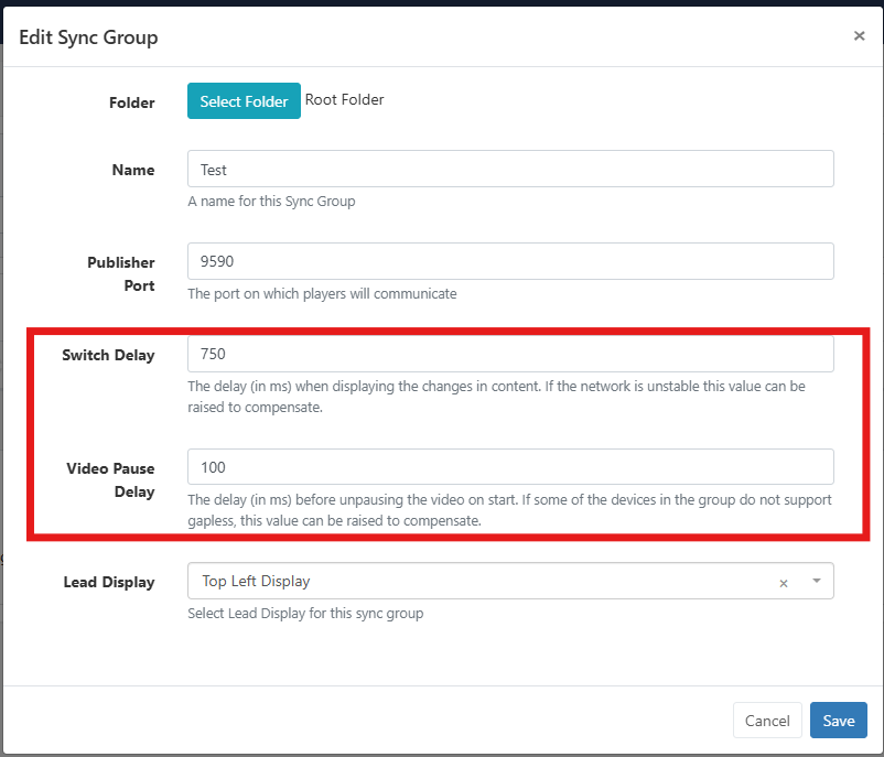 A Lead Display option will now be shown on the âEdit Sync Groupâ form. The lead display will be responsible for dictating when sync content is displayed and the timings of content changes to the rest of the displays in the group. Pick the Display that you wish to be the lead and click on Save.