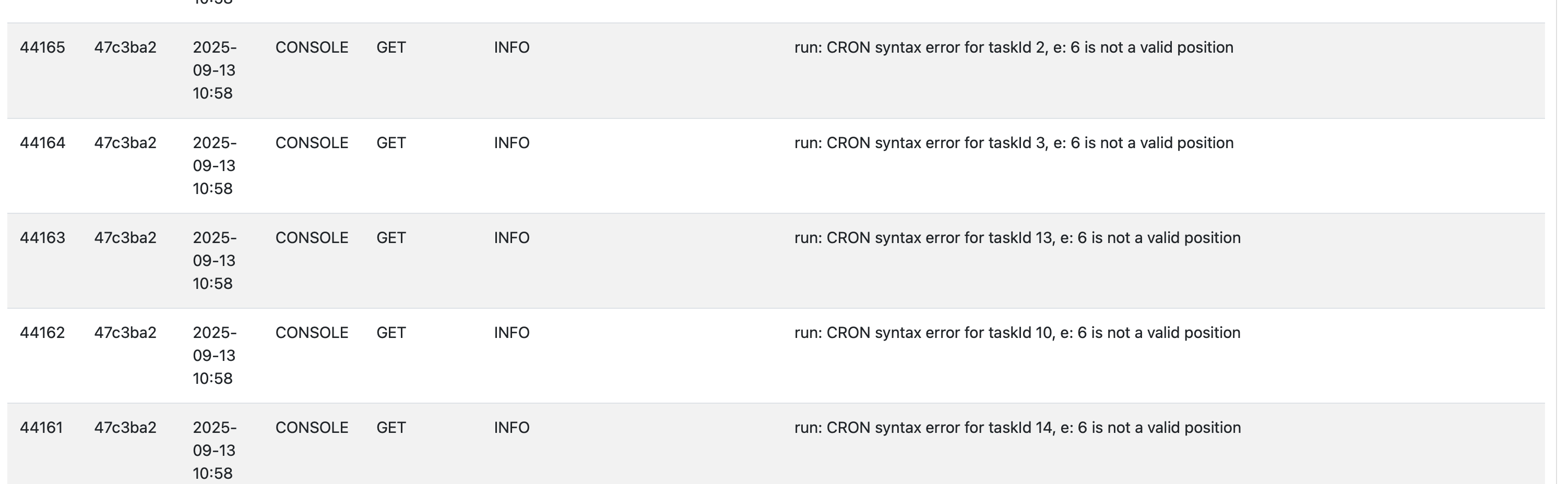 CRON syntax error … 6 is not a valid position: the scheduling string (“cron expression”) stored in the Xibo database is incorrect.