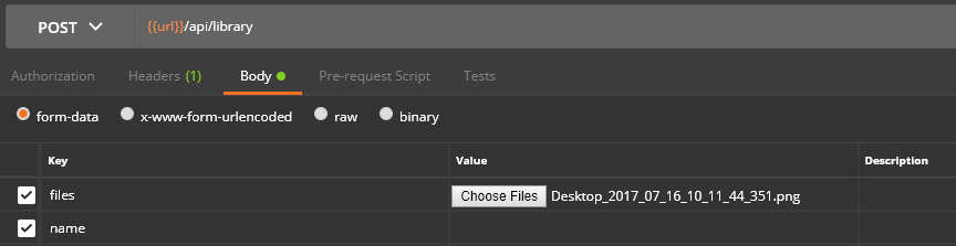 I’m trying to upload image by using the api and postman. But for some resaon by using Postman and my code I get always the error “Missing Name Parameter”.