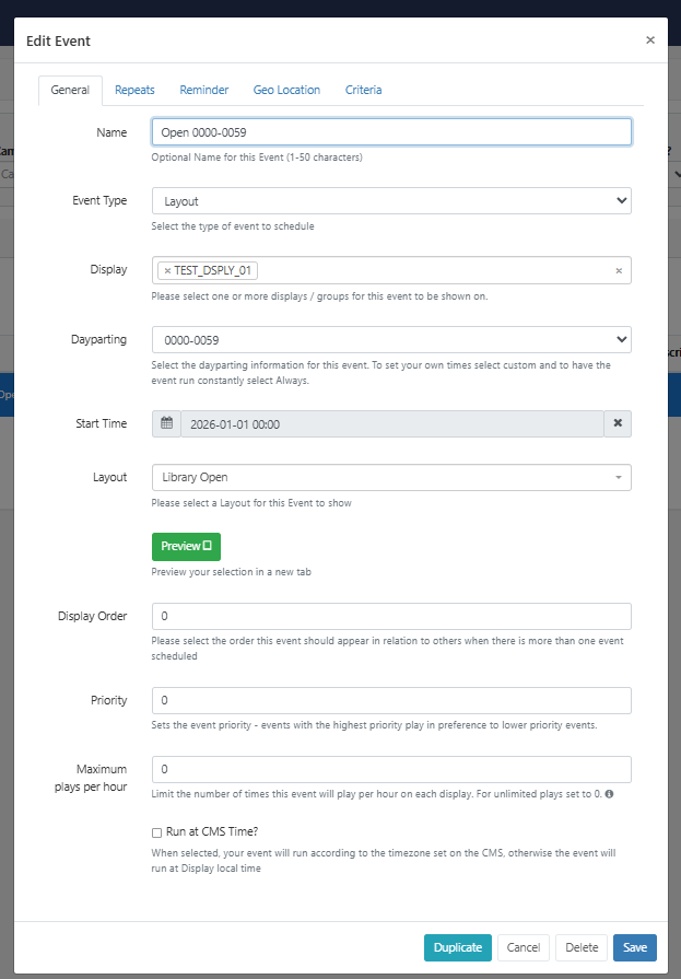 Ive installed the CMS on a Linux box in docker and set up 3 layouts. Default, Library Close and Library Open. The Default layout, which is the Default layout on the Display, is blanks. Open has an open sign and closed has a closed sign. All layouts are 15 seconds long.