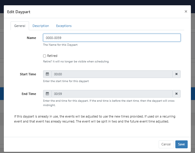 I have a daypart, 0000-0059 for testing. I have set a schedule with Library Open for with this daypart, its about 2200 but the display is not showing the Default layout, its displaying the Open Layout.