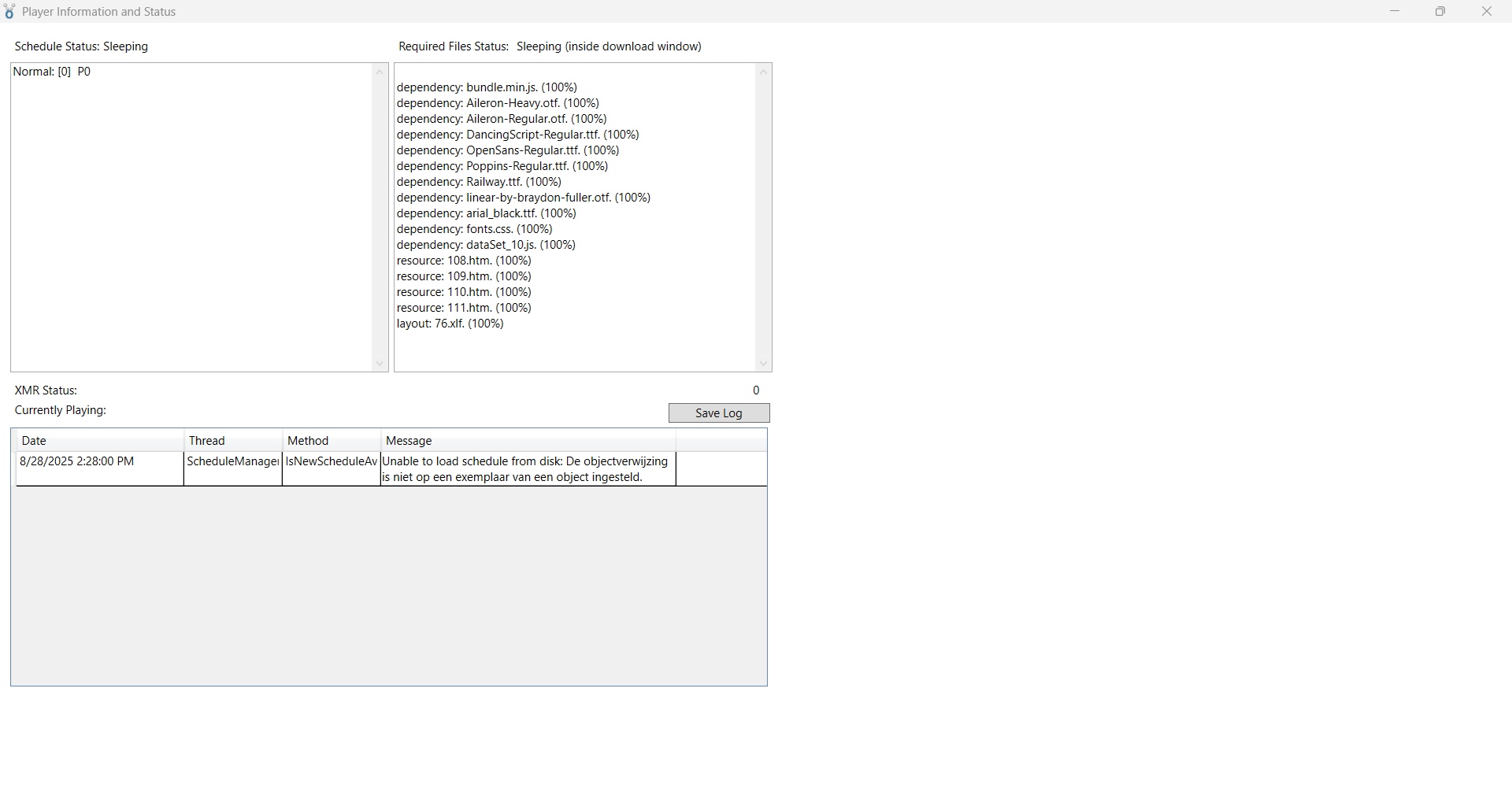 <logdate>2025-08-26 21:27:18</logdate><thread>ScheduleManagerThread</thread><method>IsNewScheduleAvailable</method><message>Unable to load schedule from disk: De objectverwijzing is niet op een exemplaar van een object ingesteld.</message> <logdate>2025-08-26 21:27:08</logdate><thread>ScheduleManagerThread</thread><method>IsNewScheduleAvailable</method><message>Unable to load schedule from disk: De objectverwijzing is niet op een exemplaar van een object ingesteld.</message>
