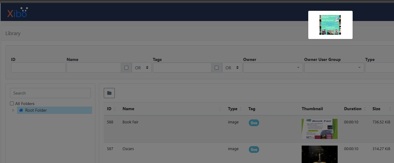 When we look at the content that is in the media library, we are not seeing a full size thumbnail of the content and just a tiny 120x67 preview (see below)