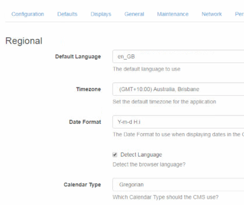 The CMS Timezone is set to Australia/Brisbane GMT+10