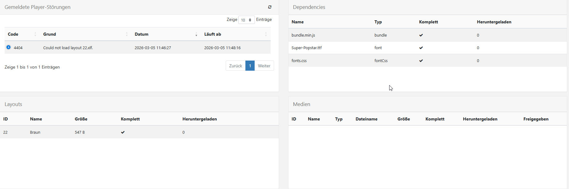 The player is now shown as green. The layout is valid and published, but all layouts have the same error. At first i also had an error saying that fonts were missing, but I have resolved that. Now only the error mentioned above appears.