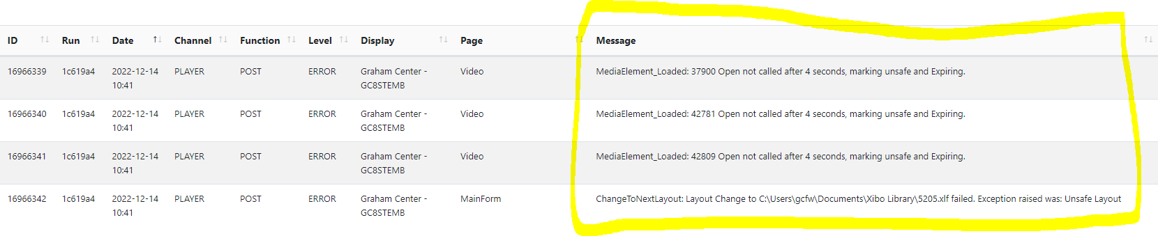 Recently we’ve had one of our signage displays suddenly revert to the default Xibo splash screen for no apparent reason. No one has altered a layout or playlist in any way, and it seems to be sporadic. We are going to try updating the player version to see if that resolves the issue. But here’s what we have found in the logs regarding that display.