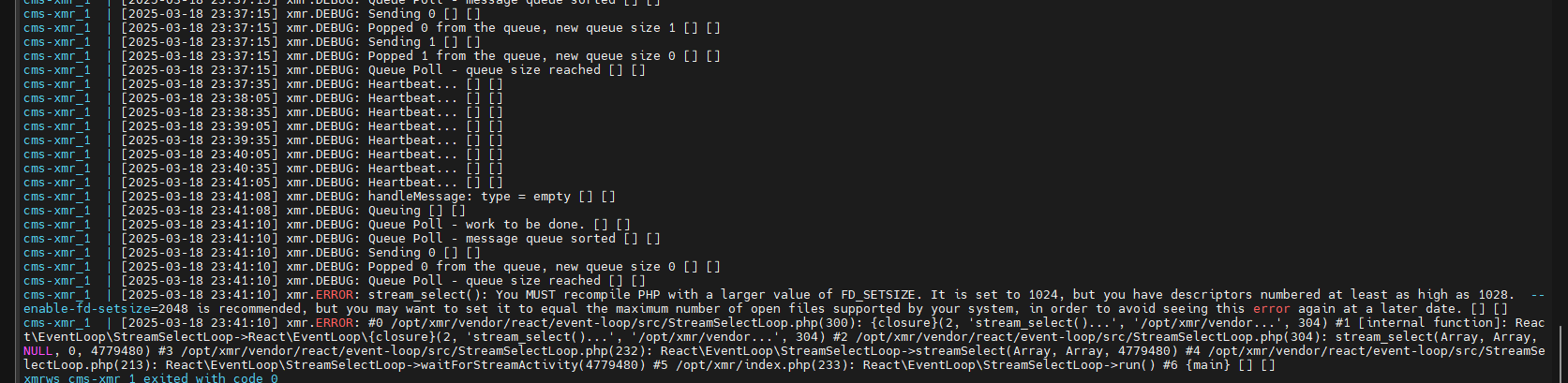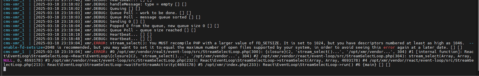 cms-xmr_1 | [2025-03-18 23:41:10] xmr.ERROR: stream_select(): You MUST recompile PHP with a larger value of FD_SETSIZE. It is set to 1024, but you have descriptors numbered at least as high as 1028. --enable-fd-setsize=2048 is recommended, but you may want to set it to equal the maximum number of open files supported by your system, in order to avoid seeing this error again at a later date. [] []
